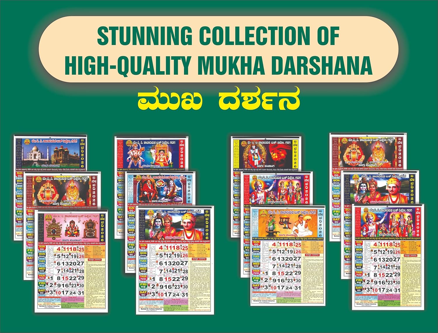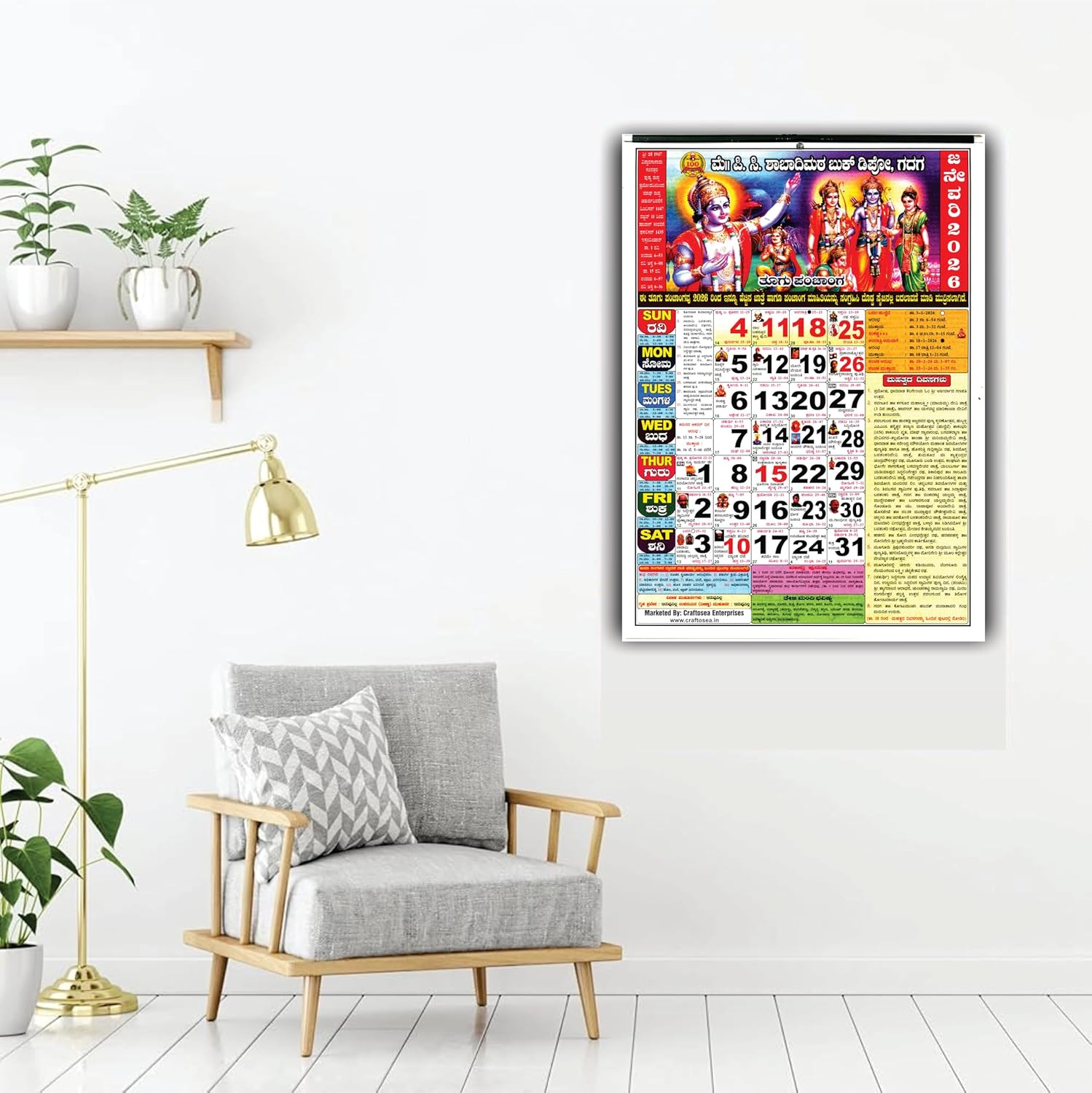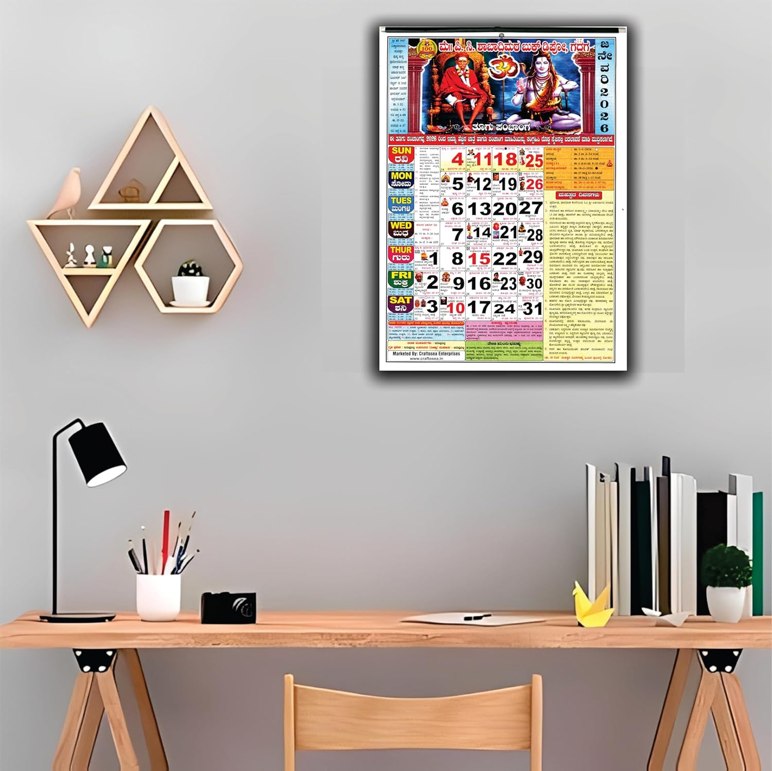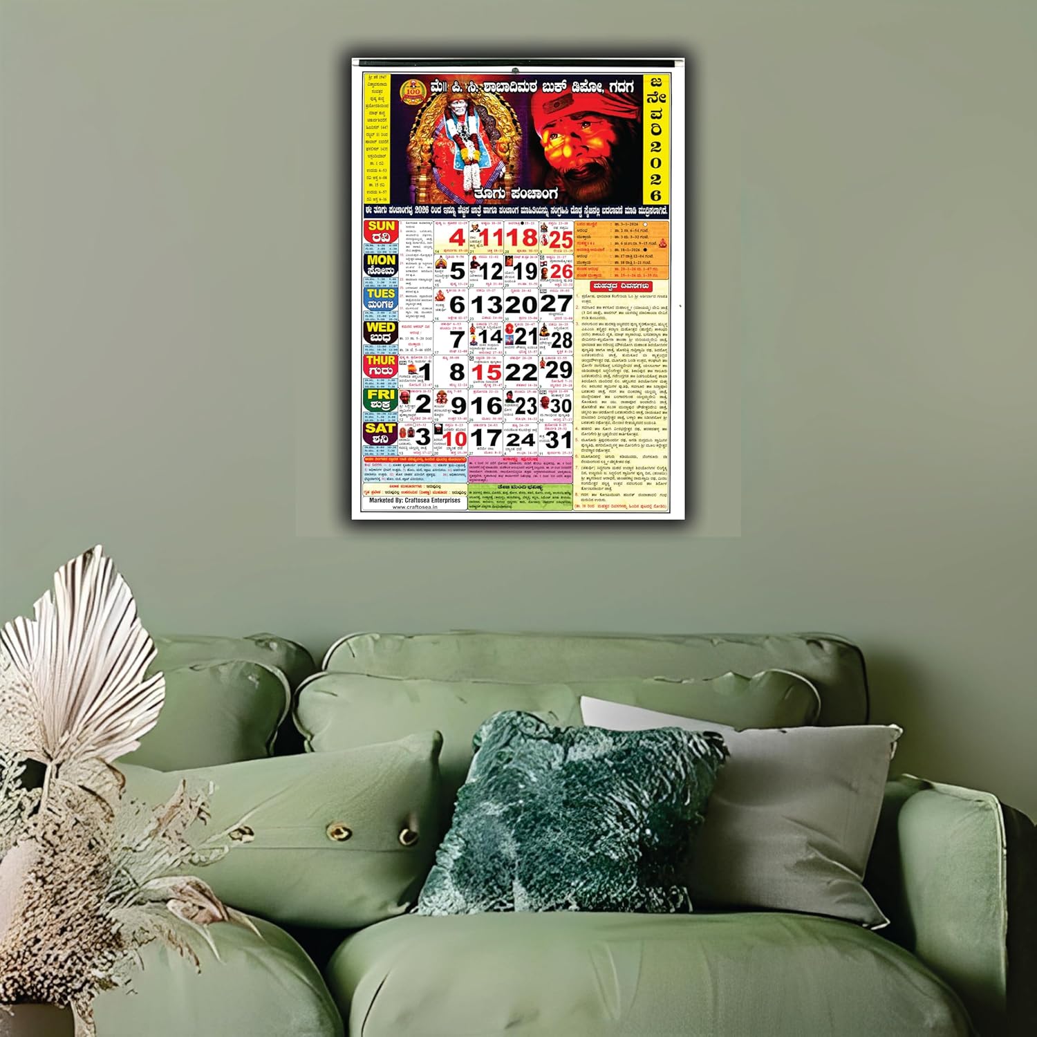 • Premium Quality & Specifications: Type: Wall Calendar / Dinadarshika (ದಿನದರ್ಶಿಕಾ) Size: Standard Large Wall Size(27.94 x 38.1 cm or 11" x 15") Material: High-quality, durable paper with vibrant, fade-resistant color printing. Binding: Standard wire or loop for easy hanging. Special Feature: Includes Full 12-Month Rasi Phala (Astrology) Forecast for 2026.